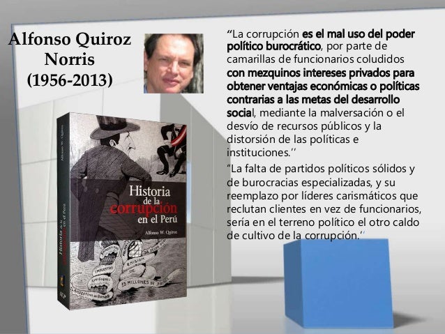Grande la expectativa levantada por el libro Historia de la Corrupción en el Perú, de Alfonso Quiroz (1956-2013). La temprana muerte del autor pesa, pero más su autoridad académica y la actualidad de la Corrupción en el devenir social y político del Perú. La lucha política hoy en día pareciera estar en un hilo, el tema que divide las aguas entre unos y otros es la Corrupción y cómo se asume. Este libro lo devoramos recorriendo una parte de nuestra patria, preguntándonos como sería si no fuera por la Corrupción. Cuando hay acervo lector, este libro evoca otros. Toda estructura cognitiva se basa en la asociación libre, espero que mis lectores añadan las suyas y pongan el tema en el candelero. La Historia de la Corrupción en el Perú proporciona una estructura útil para articular datos dispersos sobre tema tan sensible, actual y permanente. Este Libro Debe Leerse, pese a no poseer refugio emocional que permita por momentos autoengañarse y creer que la cosa es más fácil. No lo es. Por eso combate la ingenuidad voluntaria, la que linda con la estupidez autoasumida tanto como con la ingenuidad involuntaria e ignorante. Como saben bien nuestros Corruptos, el lenguaje sirve también para ocultar. La peruanísima estrategia de la “finta” esconde la realidad de modo que personajes sin irrigación sanguínea en el rostro pueden navegar entre dos aguas, a fin de ser simpáticos a corruptos y no-corruptos, pues hay empleadores en los dos (o más) lados en disputa. Por otra parte, por muchas definiciones de Corrupción que haya, discutir mucho suele ser una finta en la que Quiroz no cae, y por ello define su objeto de estudio de modo laxo – en verdad todos sabemos de qué y de quiénes habla. Se sostiene así en una enumeración extensiva: La corrupción (es) un fenómeno amplio y variado (…) No se trata tan solo del tosco saqueo de los fondos públicos (…) La corruptela comprende el ofrecimiento y la recepción de sobornos, la malversación y mala asignación de fondos y gastos públicos … . Quiroz no se enreda en teorías, presume que sus lectores saben o deben saber, y deja el asunto ahí para que no se pierda lo histórico, de fuentes contrastables que hablan por sí mismas. La definición de Corrupción se construye conforme se avanza en el Libro, y se llega a que la Corrupción ha pasado y pasa en el Perú.